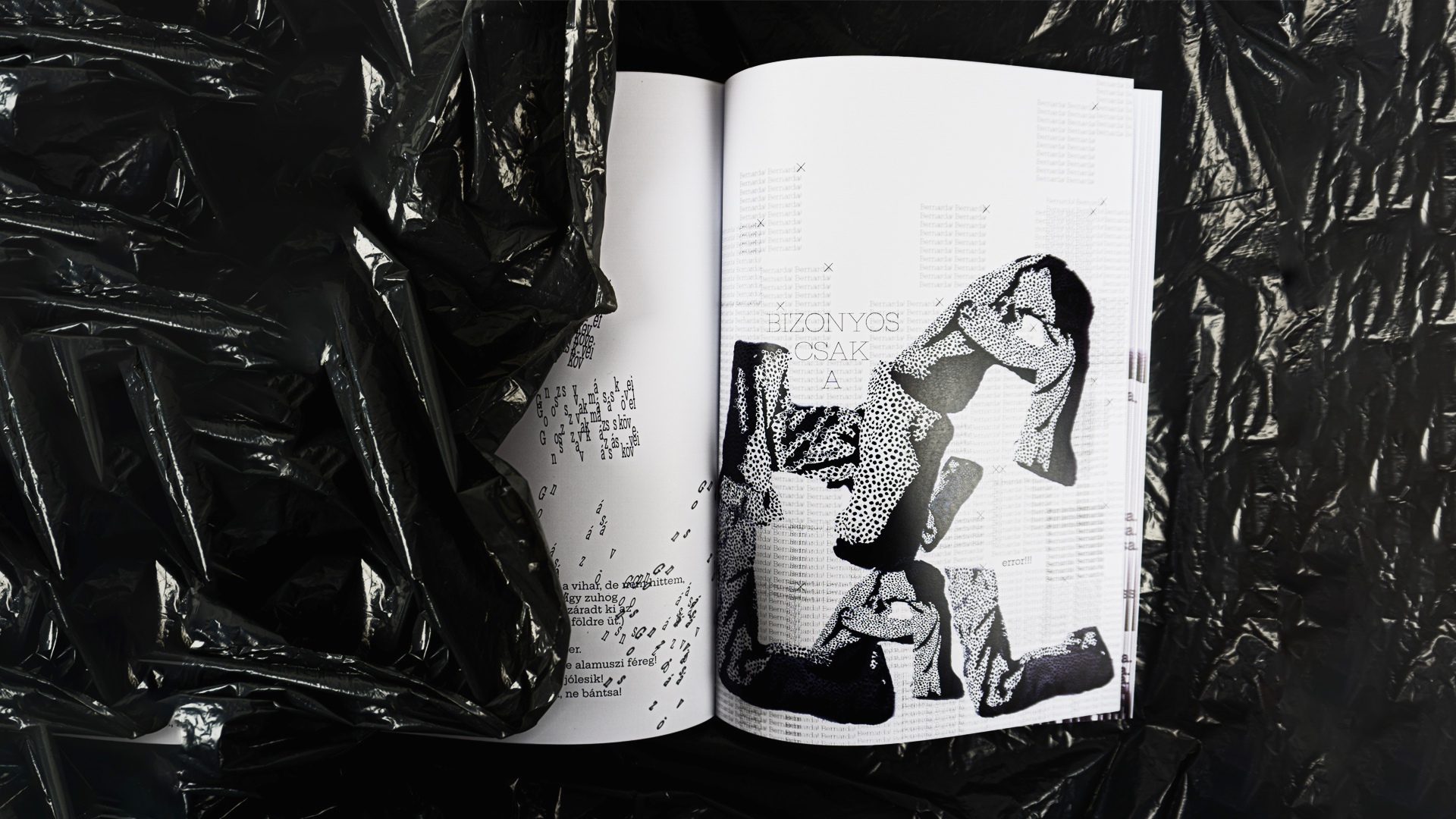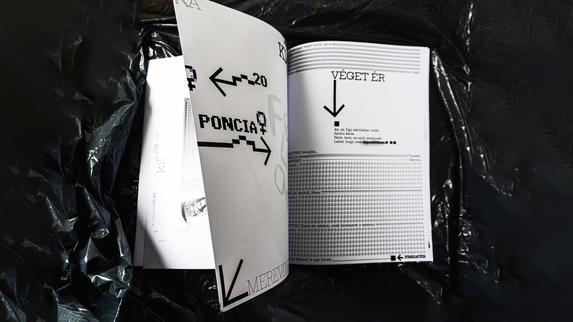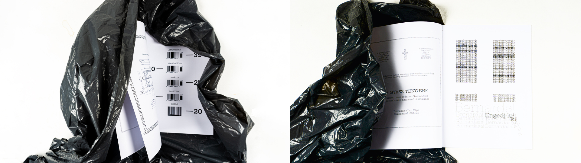 The project "Sea of Grief" is based on the stage play featured in Federico García Lorca’s The House of Bernarda Alba. The aim of the publication is not to illustrate the linear narrative of The House of Bernarda Alba, but rather to give typographic form to the collective and internal dramas of grief, oppression, and female fate. The text unfolds in a way that diverges from traditional reading—through sensory and associative means—where the shape, placement, size, and movement of the letters are as expressive as the linguistic content itself. The publication is packaged in a black garbage bag, symbolizing a discarded, suppressed, or concealed narrative thread. In the rural Spanish reality, grief, desire, and aggression have no place in the public sphere—these emotions are destined to be wrapped up and repressed. In this context, the black bag becomes a visual metaphor for concealment and exclusion.