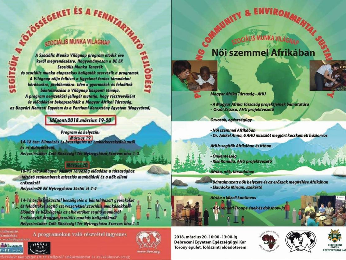A Szociális Munka Világnap program az idén ötödik éve kerül megrendezésre. Hagyományosan a DE EK Szociális Munka Tanszék és szociális munka alapszakos hallgatók szervezik a programot. A világnap célja felhívni a figyelmet fontos társadalmi kérdésekre, problémákra. Az idén a gyermekek és felnőttek bántalmazása a világnap programjának központi témája. A program nemzetközi jellegét mutatja, hogy résztvevőként és előadóként bekapcsolódik a Magyar Afrika Társaság, az Ungvári Nemzeti Egyetem és a Partiumi Keresztény Egyetem (Nagyvárad).