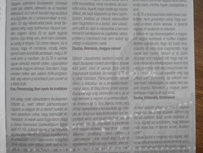 Két dolog miatt választottam Budapestet. Először is, mert otthon párhuzamosan végzem a magyar és a német szakot, és nem szerettem volna, hogy bármelyik elmaradjon. A másik azzal függ össze, hogy a Janus Pannonius Szakkollégium tagjaként 17-18. századi iskolai színjátékokkal, úgynevezett iskoladrámákkal foglalkozom. Itt sokkal több ezzel kapcsolatos anyaghoz férek hozzá, mint otthon, arról nem is beszélve, hogy az OSZK-ban nagyon sok kézirat megtalálható.