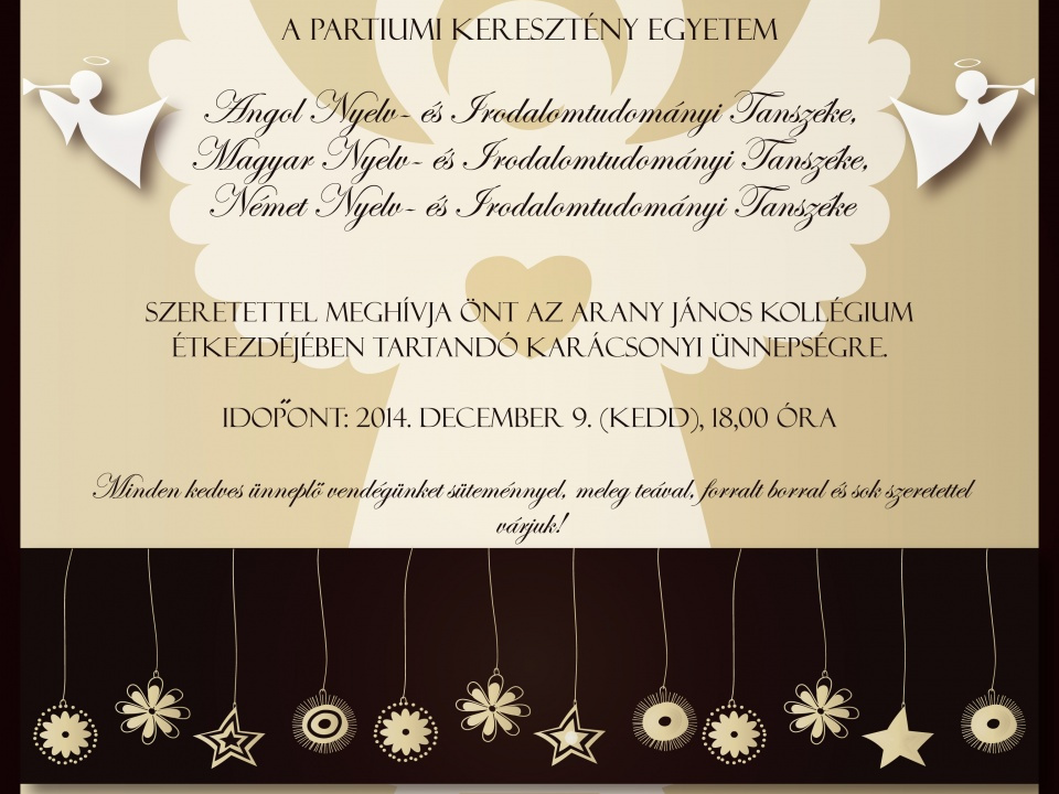 Partiumi Keresztény Egyetem, Bölcsészettudományi és Művészeti Kar, Nyelv és Irodalomtudományi Tanszék, Angol nyelv és irodalom (BA). Hírek, Christmas Party 2014. Bemutatás, tanmenet, felvételi, oktatók, kutatás, dokumentumok, alumni, események, keresés.