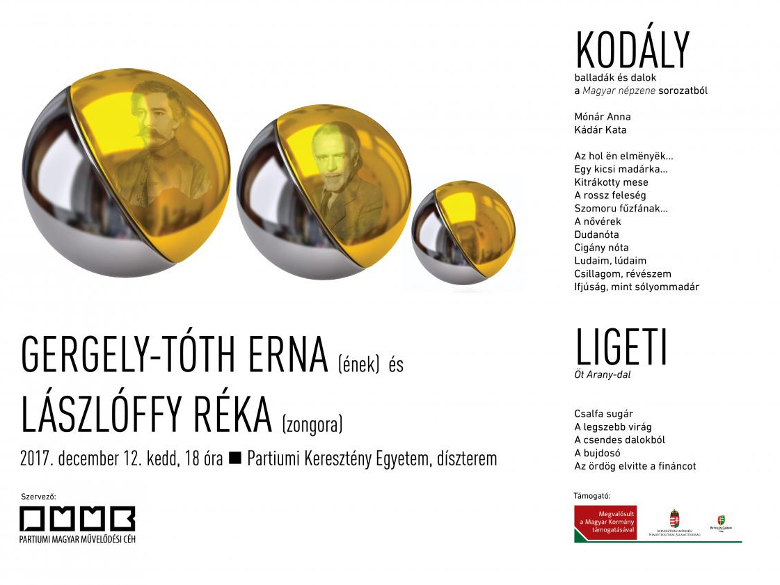A 200 éve született Arany János és a 135 éve született Kodály Zoltán emlékére a Partiumi Magyar Művelődési Céh szeretettel invitálja a nagyváradi zenebarát közönséget december 12-én 18 órára a Partiumi Keresztény Egyetem dísztermébe, Gergely-Tóth Erna dalestjére. Zongorán közreműködik Lászlóffy Réka. Műsoron balladák és dalok Kodály Zoltán Magyar népzene sorozatából, valamint elhangzik Ligeti Györgytől az Öt Arany-dal.
