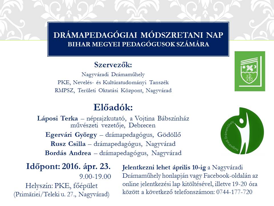 Partiumi Keresztény Egyetem, Gazdaság és Társadalomtudományi Kar, Humántudományi Tanszék, Az óvodai és elemi oktatás pedagógiája (BA). Hírek, DRÁMAPEDAGÓGIAI MÓDSZERTANI NAP . Bemutatás, felvételi, online beiratkozás, rendezvények, alumni, képgalériák, események, keresés.