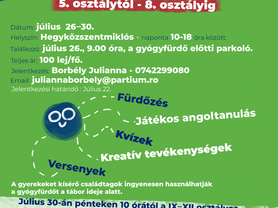 English Summer Camp címen szervez angol nyelvi gyerektábort Hegyközszentmiklóson a Partiumi Nyelvközpont, a Hegyközszentmiklósi Gyógyfürdővel és a Partiumi Keresztény Egyetem angol szakos hallgatóival közösen. A tábor július 26-tól július 30-ig tart, mindennap 10.00 és 18.00 óra között. A tábor az általános iskolásoknak szól (5 – 8. osztály), azonban utolsó nap, pénteken 10.00 órától a 9 – 12. osztályosoknak ECL vizsgaszimulációt tartanak B1, B2 és C1-es szinten a hegyközszentmiklósi Toldy általános iskolában. A táborban fürdőzést és ebédet is biztosítanak a szervezők. A tábor teljes ára fejenként 100 lejbe kerül, az ECL vizsgaszimuláció azonban ingyenes. A helyek száma korlátozott, ezért mihamarabb jelentkezzenek Borbély Julianna szervezőnél a következő elérhetőségen, ahol bővebb információkat is megtudhatnak:
