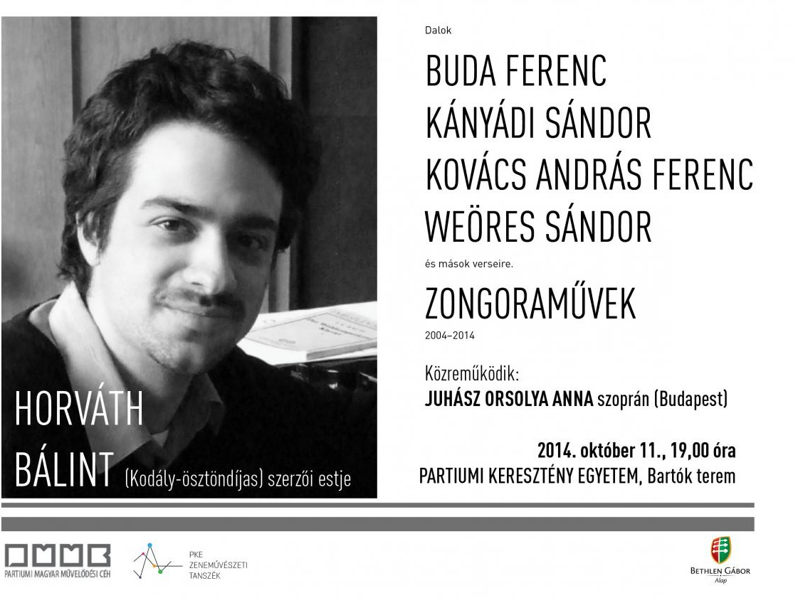 A Partiumi Magyar Művelődési Céh szeretettel várja a nagyváradi közönséget a Kodály-ösztöndíjas Horváth Bálint (Budapest) szerzői estjére, október 11-én (szombaton) este 7 órától a Partiumi Keresztény Egyetem Bartók termébe. Műsoron: dalok Buda Ferenc, Kányádi Sándor, Kovács András Ferenc, Weöres Sándor és mások verseire valamint zongoraművek 2004-2014. Közreműködik: Juhász Orsolya Anna, szoprán (Budapest). A belépés díjtalan.