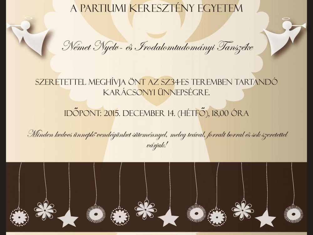 Partiumi Keresztény Egyetem, Bölcsészettudományi és Művészeti Kar, Nyelv és Irodalomtudományi Tanszék, Német nyelv és irodalom (BA). Hírek, Karácsonyi ünnepség 2015. Bemutatás, felvételi, tanmenet, államvizsga, rendezvények, események, keresés.