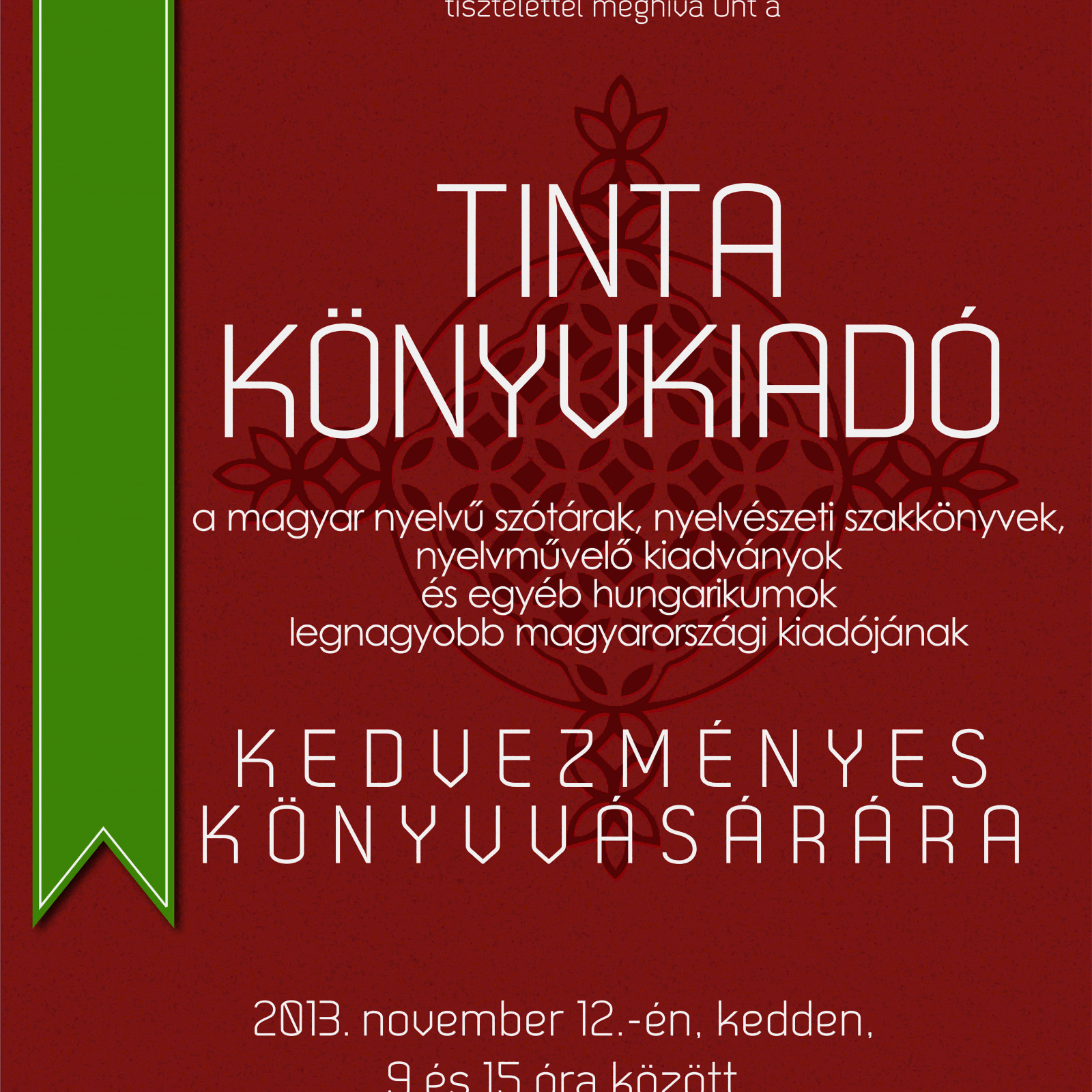 November 12-én, kedden a Partiumi Keresztény Egyetemen könyvvásárt rendez a Budapesti Tinta Könyvkiadó, a magyar nyelvű szótárak, nyelvészeti szakkönyvek, nyelvművelő kiadványok és egyéb hungarikumok legnagyobb magyarországi kiadója, amelyet a szélesebb olvasóközönség elsősorban a neves nyelvművelő, Grétsy László nagy sikerű könyvei, köztük a Nyelvművelő kéziszótár és a Nyelvi Játékaink Nagykönyve révén ismerhet.