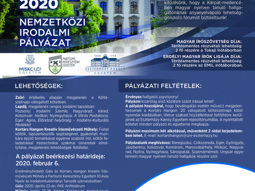 A PKE Magyar Nyelv- és Irodalomtudományi Tanszéki Csoportja immár másodszor látja vendégül és ugyanakkor szervezi a Kortárs Hangon '20 nemzetközi irodalmi pályázatot.