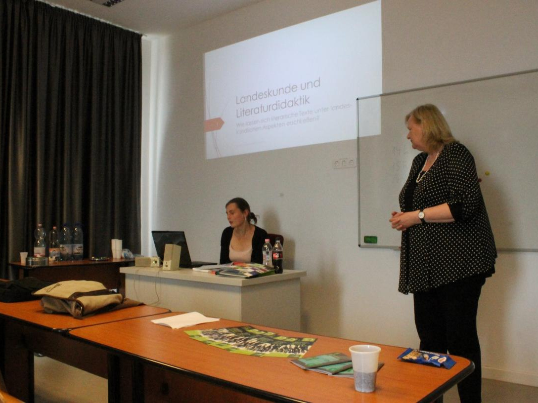 A köz- és felsőoktatási intézmények pedagógusait, leendő némettanárokat megszólító program, az országismeret és irodalom didaktikájának centrális aspektusait vizsgálta, egy felvezető, elméleti előadás majd egy ezt követő, gyakorlati műhelymunka keretében. Az elméleti rész, az irodalmi szövegek országismereti vetületeinek kérdéskörét a következő alapfogalmak mentén helyezte a viszgálódás középpontjába: interkulturális németoktatás, a transzkulturalitás fogalma, az országismeret oktatásával kapcsolatos kulturatudományi megközelítések, irodalmi szövegek kiválasztási kritériumai a német mint idegen nyelv oktatásában, módszertani lehetőségek feltárása. Az előadást követő műhelymunka keretében a jelenlévők irodalmi szövegek elemzésével és azok felhasználásának módszertani lehetőségeivel ismerkedtek.