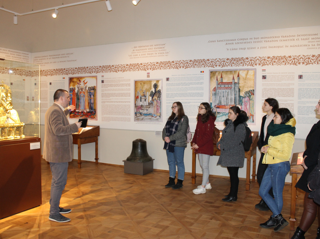 Az első állomás a "Regum gemma, Ladislæ – Szent László király műve és tisztelete" kiállítás megtekintése volt, aminek részleteibe Lakatos-Balla Attila történész, muzeológus vezette be a hallgatókat.