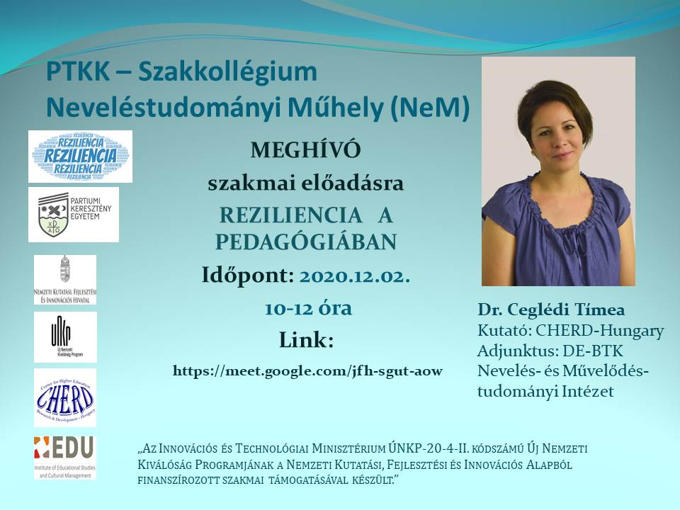 PTKK – Szakkollégium Neveléstudományi Műhely (NeM) meghívására Dr. Ceglédi Tímea a DE-BTK Nevelés- és Művelődéstudományi Intézetének adjunktusa, a CHERD-Hungary kutatója, tart előadást Reziliencia a pedagógiában címmel.