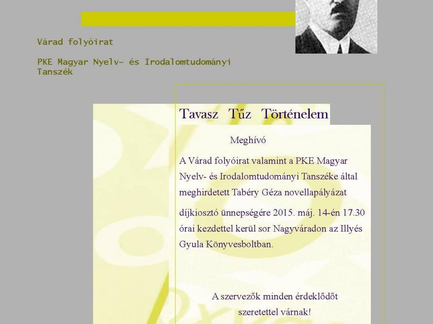Parteneri: Revista literară "Várad" și Departamentul de Limba și Literatura Maghiară (Universitatea Creștină Partium) Locul și data desfășurării evenimentului: Oradea, Librăria "Illyés Gyula", 14. mai 2015, ora 17.30